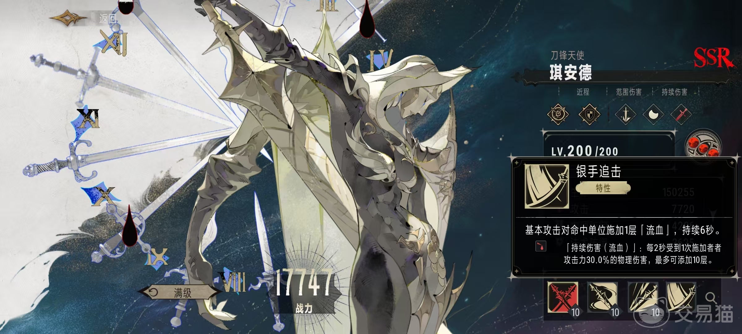 琪安德的普攻尖刀,可以对准目标方向扇形范围内的敌方单位,造成120%攻击力的物理伤害,因为是属于范围伤害类型,所以攻击到的目标还是比单体要多一些。自身的特性银手追击,在基本攻击命中目标后,会为对方添加一层流血效果,持续6秒钟。对方被流血影响之后,每两秒钟就会受到一次伤害,伤害按照施加者攻击力的30%计算,属于物理伤害类型。流血最多可以叠加到10层,如果能够叠加满,仅仅是持续伤害就已经很可观了。