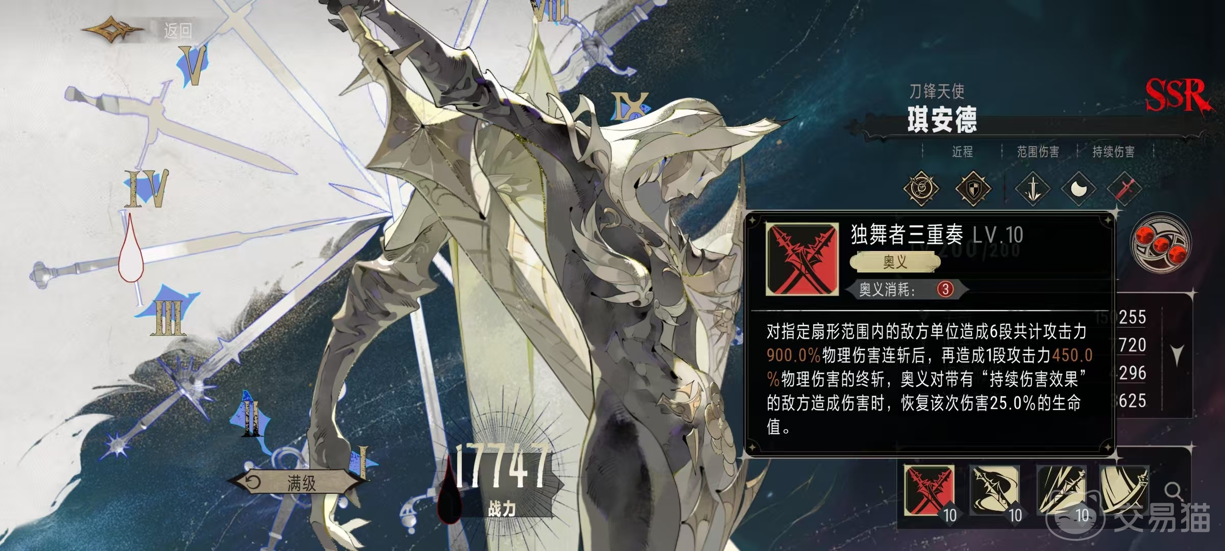 奥义技能独舞者三重奏,对指定扇形范围内的敌方单位,造成一共六段伤害,伤害总量为攻击力的900%,在进行连斩之后,可以再造成一段攻击力450%的物理伤害。该奥义技能,对带有持续伤害效果的目标造成输出时,可以按照该次伤害的25%来恢复自身生命值。这里的持续伤害可以是流血,也可以是其他效果,所以阵容搭配的时候尽量找一些带有持续伤害的队友。