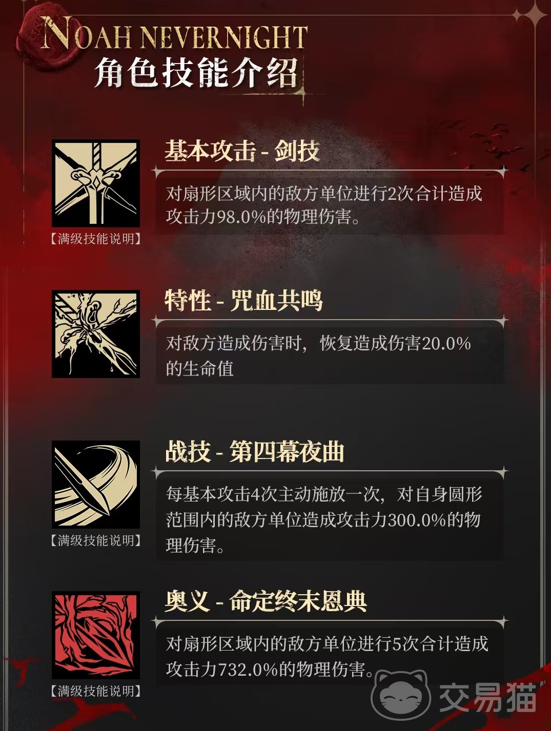 诺亚奈蒙特的基本攻击是剑技,可以对扇形区域内的敌方单位进行两次合击,一共造成攻击力98%的物理伤害。因为攻击的是扇形区域,所以目标肯定会多一些,这样即使单次攻击力低,但伤害总量不一定就少。特性咒血共鸣,在对敌人造成伤害时,可以根据造成的伤害来恢复自身生命值,恢复的数值是本次伤害的20%。