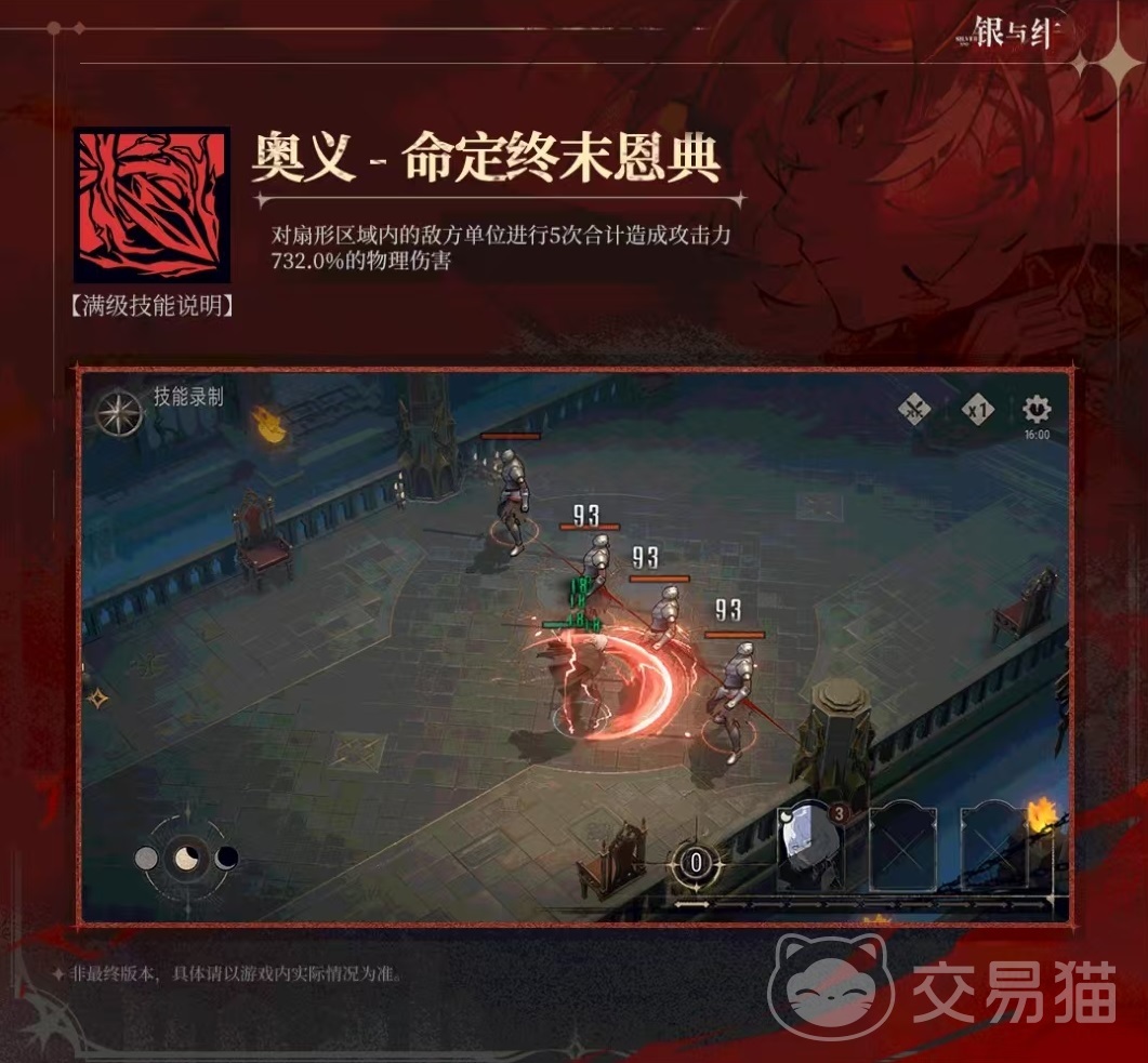 战技第四幕夜曲,每进行4次基本攻击,就可以主动释放一次这个技能,对自身圆型范围内的敌方单位造成300%攻击力的物理伤害。奥义技能命定终末恩典,对扇形区域内的敌方单位进行5次攻击,合计造成攻击力732%的物理伤害。其实这个英雄并没有其他的特点,包括控制或者是增益等,有的仅仅是依靠自身伤害来进行吸血。好在无论是战技还是奥义技能都是范围输出。这样在很多战斗中尤其是面临对方数量比较多的时候,都是比较有优势的。