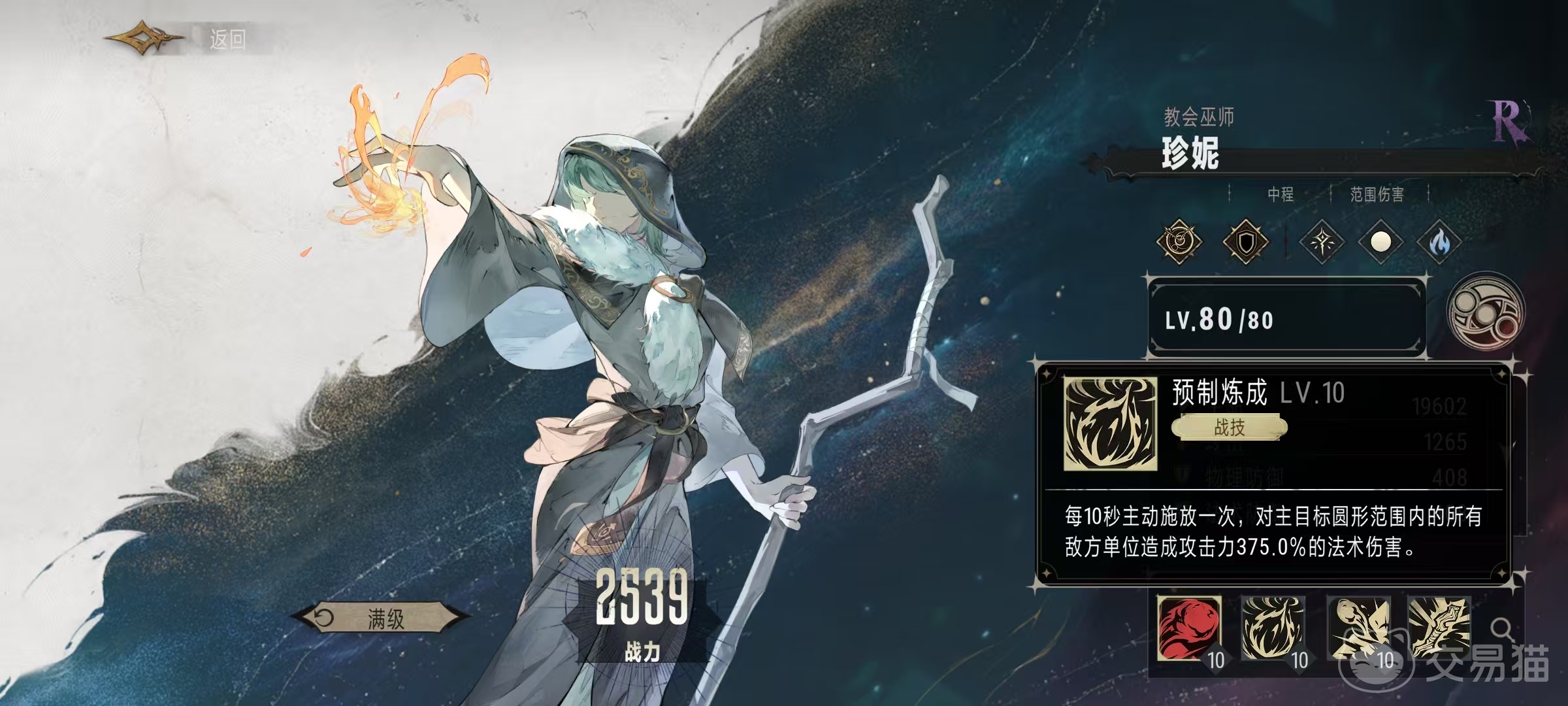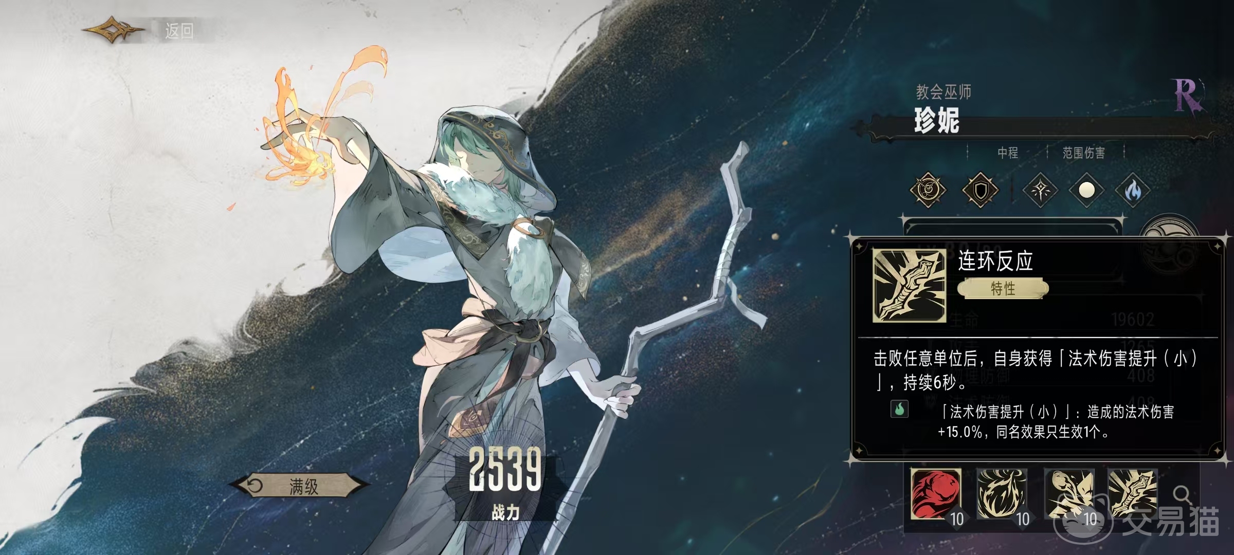 自身特性连环反应,是需要击败任意单位后生效,使自身获得一个持续6秒的小型法术伤害提升效果,使造成的法术伤害增加15%,很微弱的提升,而且还需要击杀后生效,所以价值并不高。战技预制练成,每10秒钟主动释放一次,对主目标圆型范围内所有敌方单位造成357%攻击力的法术伤害。单纯伤害技能,自身属性较低,所以伤害也没有太高价值。