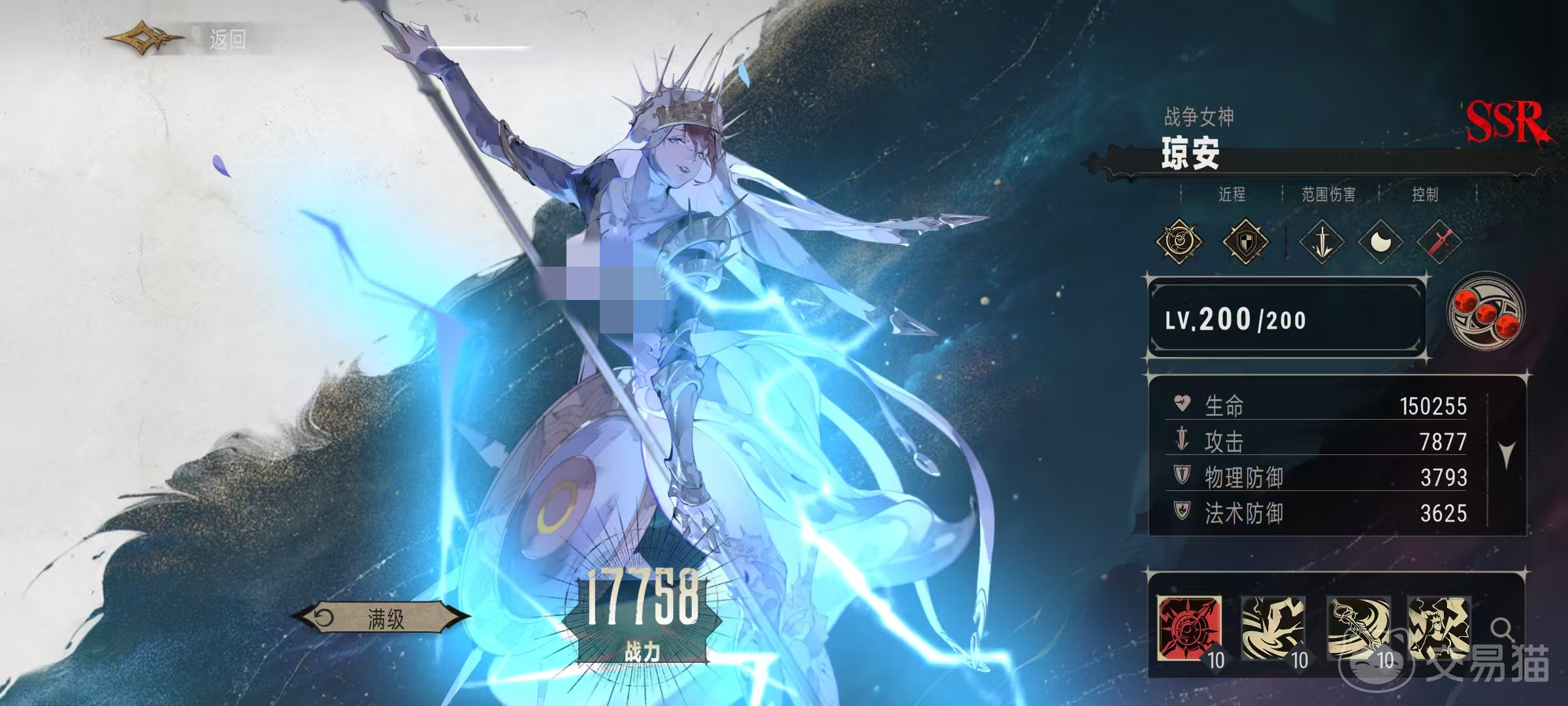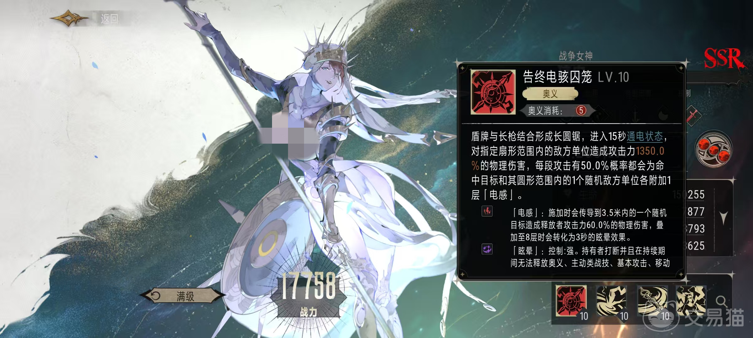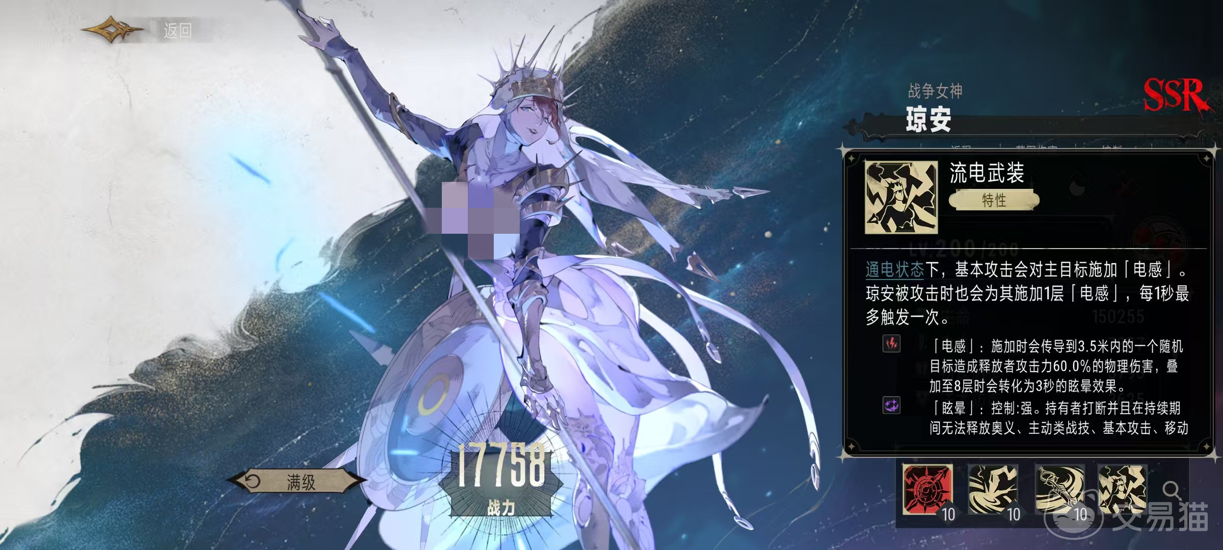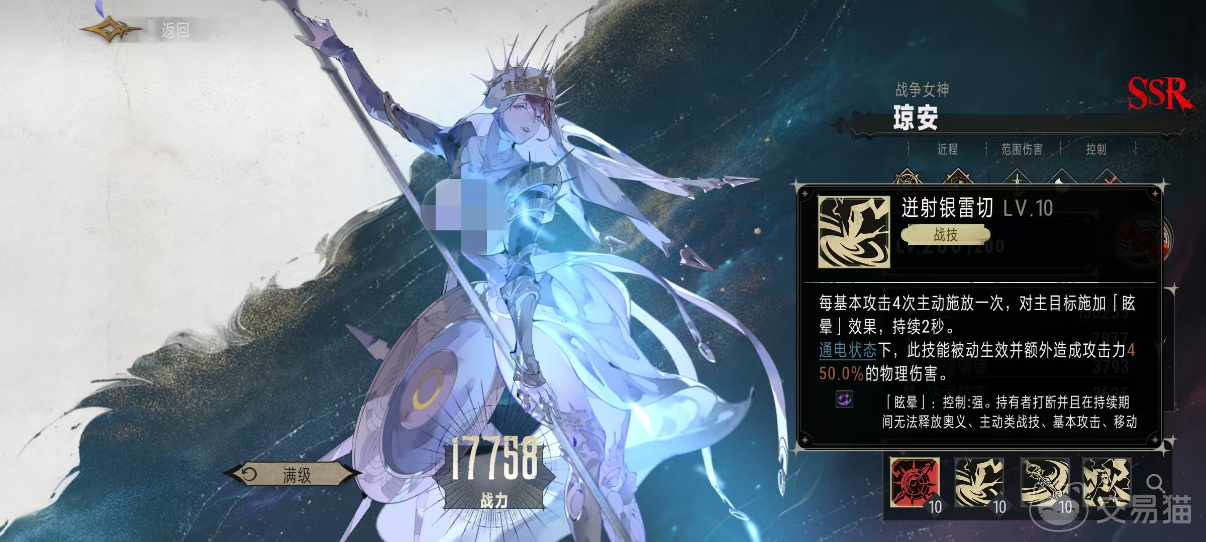 奥义技能对指定扇形范围内的敌方单位造成1350%攻击力的物理伤害,每段攻击还有50%几率为命中的目标和其圆型范围内的一个随机单位各附加一层电感。可以说开启奥义技能之后的琼安,将真正化身为战争女神,在场上疯狂输出,打出高额范围伤害和控制效果,绝对是目前最值得选择的核心主c之一。