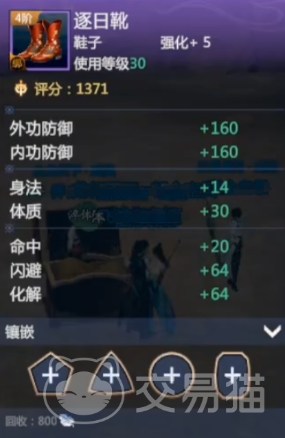 然后从基础属性方面来看的话,可以获得外功或者内功的防御力,数值高达160。然后身法也为14点,体质则是30点。命中为20,闪避64,化解64。由此看来属性加成很不错,让你获得高额防御的同时又可提升命中率。