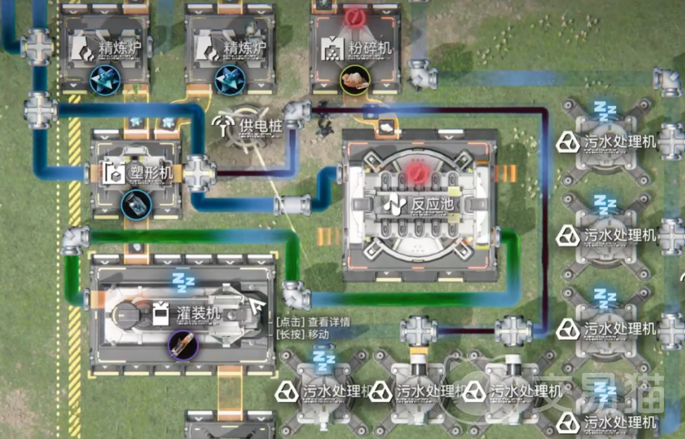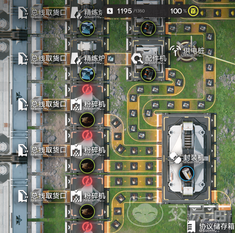 如果我们放入一个罐装机之后,通过核心区域的电流输送就能够让这个罐装机运转起来。灌装机的话可以制作各种胶囊,然后这些胶囊再通过传送带输送至仓库里面。这样我们在进入仓库中将其拿走就可以用了。