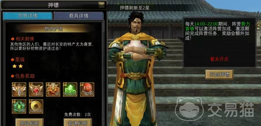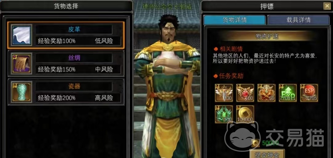 如果想要押镖,首先要加入大唐猛将阵营,这是大唐王朝的官方军队,然后在长安的标识工会会长那里去接押镖任务,不过在接任务之前一定要确保穿好了副职业装备,然后将线路切换到阵营线就可以了。完成任务需要先提供一定数量的押金,主要奖励包括声望经验,功勋贡献。等还有副职业经验。拣选任务之后会随机出现一个星级,这个星级会对最后的奖励产生很重要的影响。