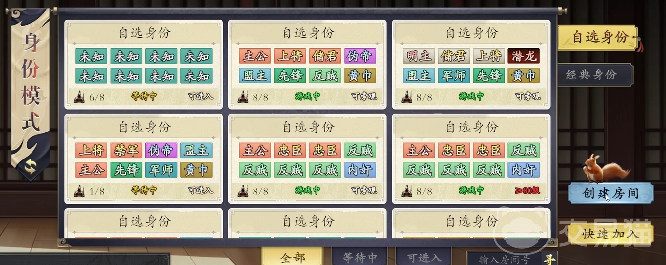 在身份模式中参加的玩家们可以自由的选择自己的身份,这里一共设置有16种身份。其中就包括了刺客、主公、先主、黄巾、潜龙、明主、内奸、忠臣、储君、上将、禁军、先锋、盟主、军师和伪帝,另外这些身份的关系也存在一定的联系。有一些是联盟,有一些则是死敌。