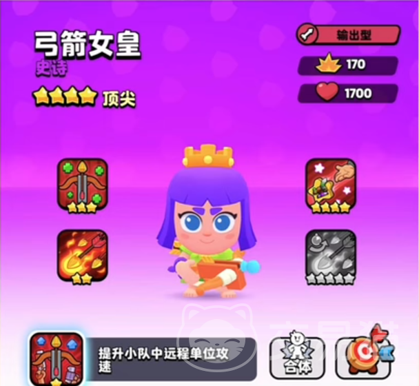 3、弓箭女皇,这是远程输出英雄,输出能力在线,也具备增益buff的角色,该角色数量越多带来的攻速提升效果就越强;2星时每隔10秒就能发射蓄力爆炸箭矢攻击敌方,形成穿透输出,3星时可回复90生命,4星带来连弩法术效果。