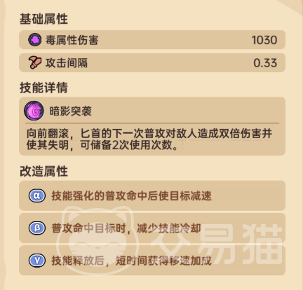 夜幕锋刃的核心技能名为暗影突袭,允许玩家储存两次使用机会。每次使用玩家向前翻滚实现快速位移,让敌人难以捉摸你的轨迹,所以往往能发挥出奇效。使用暗影突袭后的下次普攻伤害还能翻倍,能使敌人短暂失明,在敌人视线受阻时则是你进攻的好时机,因此夜幕锋刃在战斗中拥有极高的机动性。