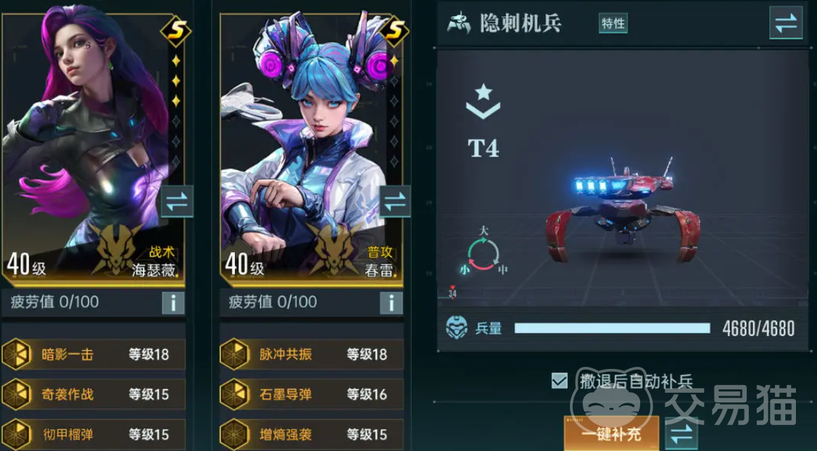 隐刺机兵非常适合搭配速射队或普攻队,这样可以充分发挥它高攻速的优势,也能让速射或普攻英雄频繁触发技能。最佳搭配是“海瑟薇”,这个角色的普攻有概率判定为背击,完美契合隐刺机兵的背击加成,提升队伍的爆发输出,短时间内快速歼灭敌人。