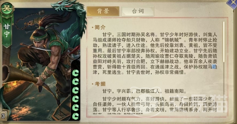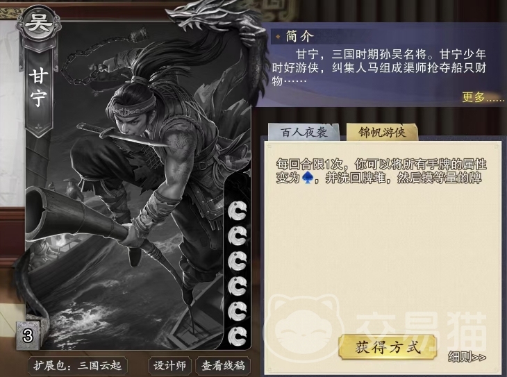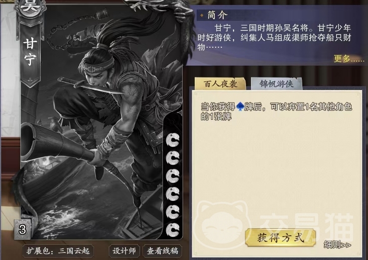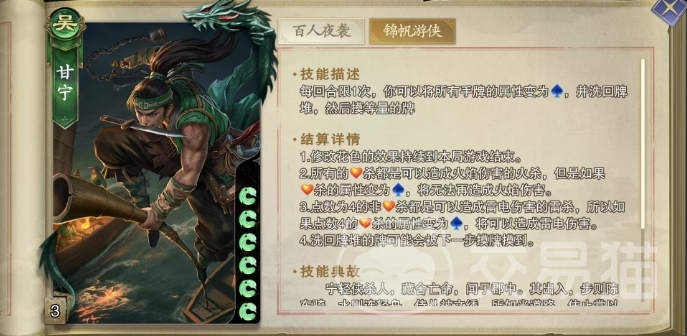 甘宁这张卡拥有的初始六格体力和吴国阵营中罕见的特殊身份,成为了众多玩家心目中的必玩卡,其实这一点也主要是因为前期这张卡是可以通过做任务获取,而不用大家去购买,而说到能力的话,大家首先看他的百人夜袭技能,这项技能允许甘宁在每当有角色获得水属性的牌时,果断弃置另一名角色的一张手牌,甚至是卜卦区中的牌,如那张令人头疼的乐不思蜀卡牌效果,也能因此而被巧妙移除。