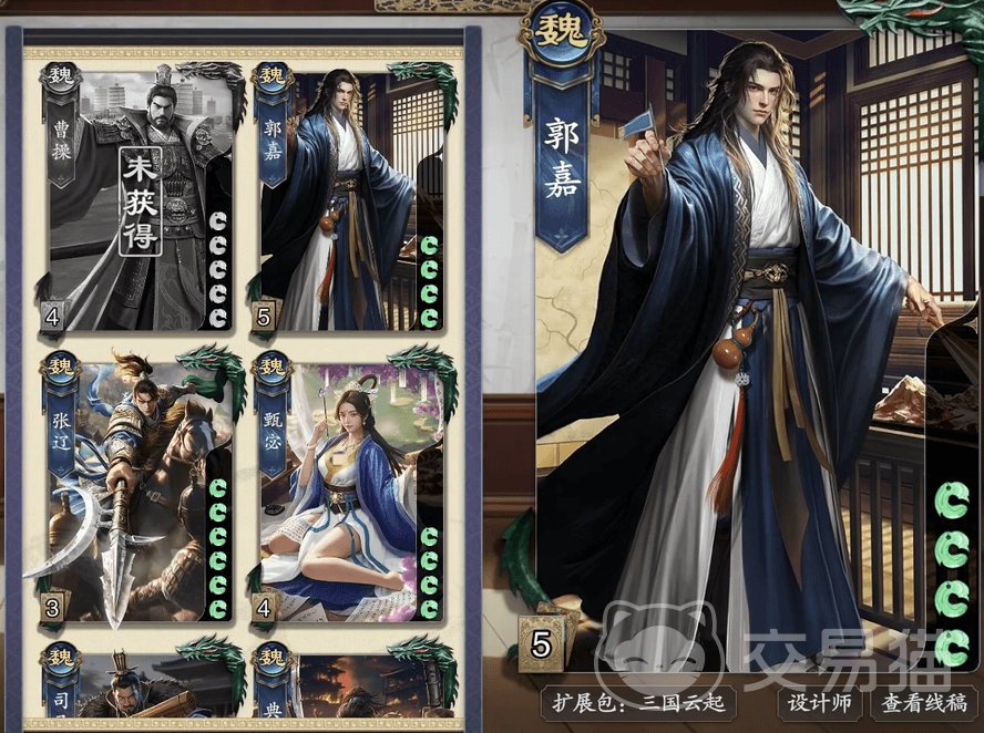 郭嘉的“十胜十败”能在受伤时多摸2张牌,然后还可以交给其他角色任意一张手牌,让其下回合出杀次数加1,他的“天妒英才”会在回合开始时卜卦,若结果不是绿色梅花则遭受一点伤害,若是则得到卜卦牌,他的特殊技是在自身阵亡时,可以选择其他角色,让其对距离1内的所有敌人造成1点伤害。