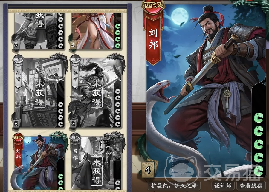 他的“斩蛇起义”可以让我们选择1张除杀以外的手牌,并销毁当局中所有的同名牌,接下来本局游戏每次弃牌后,都可以让一名其他角色摸2张牌,他的“大风歌”每个回合限1次,能当我们获得点数为5的牌后自由选择放弃,并立刻重新洗牌,随机弃置其他角色各一张牌,最后让一位角色持续摸牌到手牌上限。