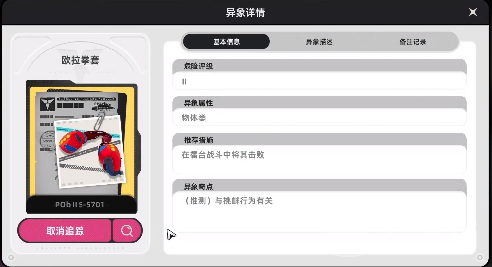 游戏中的剧情是伴随着解决各类异常现象来陆续解锁的,在完成对战后是会有机会收容异常物的。异象的产生基本上都是物体陷入了异常情绪下产生的,所以将它们击败后是有机会获得它们的,有些就有可能成为武器。想要在游戏中获得欧拉拳套的话,就需要在半角街这个位置附近找到它,或者是通过完成任务【后街拳套】调查任务后都能获得这个拳套武器。如果说玩家在异象调查局所在地图的话,可以直接找袋先生npc处通过兑换粉尘来获得,粉尘是通过击杀各类boss来随机获得。