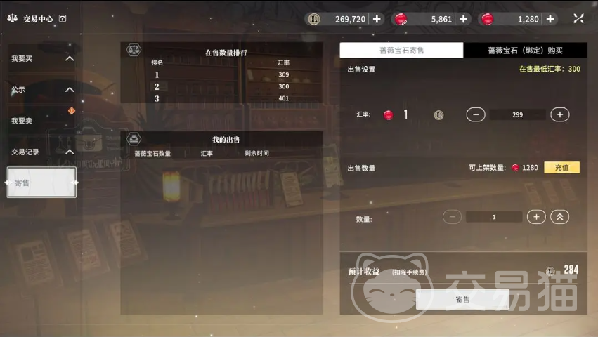 寄售是在货币不够的情况下可考虑的,在寄售区寄售蔷薇宝石,或者是购买蔷薇宝石,寄售的宝石不能连续下降,库存有实时的变动,每次购买的宝石数量可能会比较设置的要少,成功寄售也是会根据交易金额,收部分的手续费。