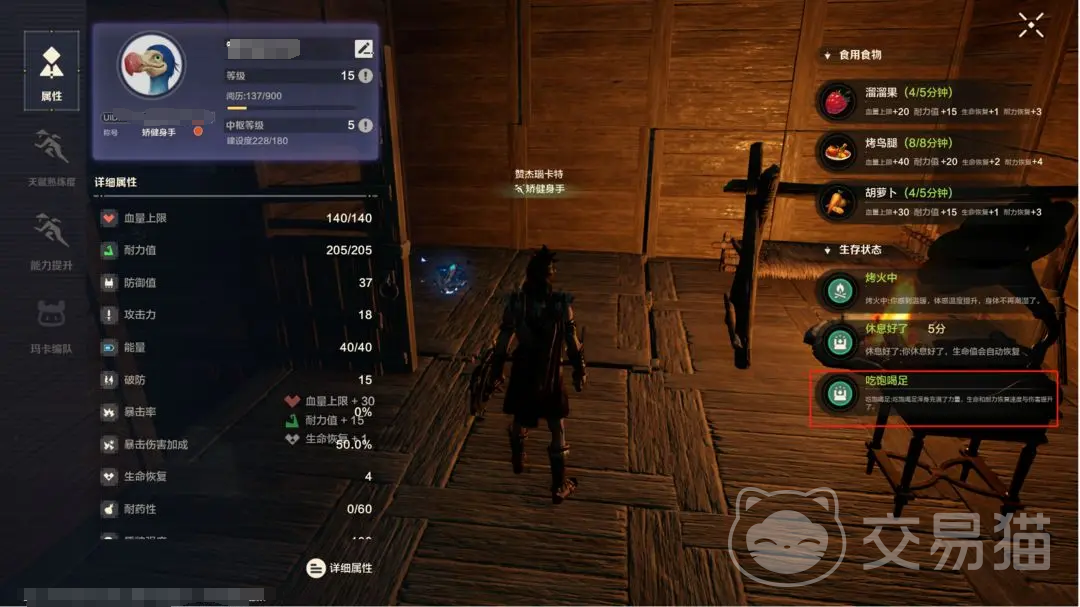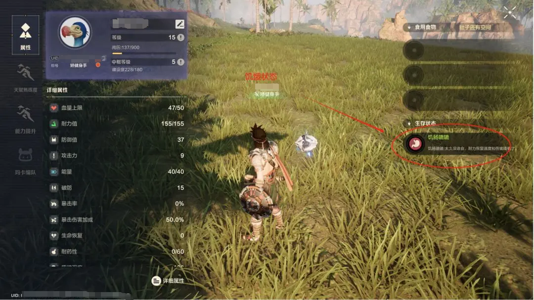 游戏里角色有两种状态,一种正面的增益状态,另一种则是负面的减益状态,负面状态中,饥饿,浸水,寒冷都是比较常见的,饥饿和浸水会影响耐力回复和伤害,寒冷状态会增加耐力消耗,降低伤害。饥饿又是最好消除的负面效果,只需要让角色食用任意的食物就能消除,而当角色吃下去三种不同的食物后,就能获得“吃饱喝足”的增益状态,此时角色的生命和耐力回复,以及伤害效果都会得到提升,食用的是已经烹饪过的料理,那么就能维持更长时间的进食增益效果,不同品质的料理增益维持的时长也是各不相同的。