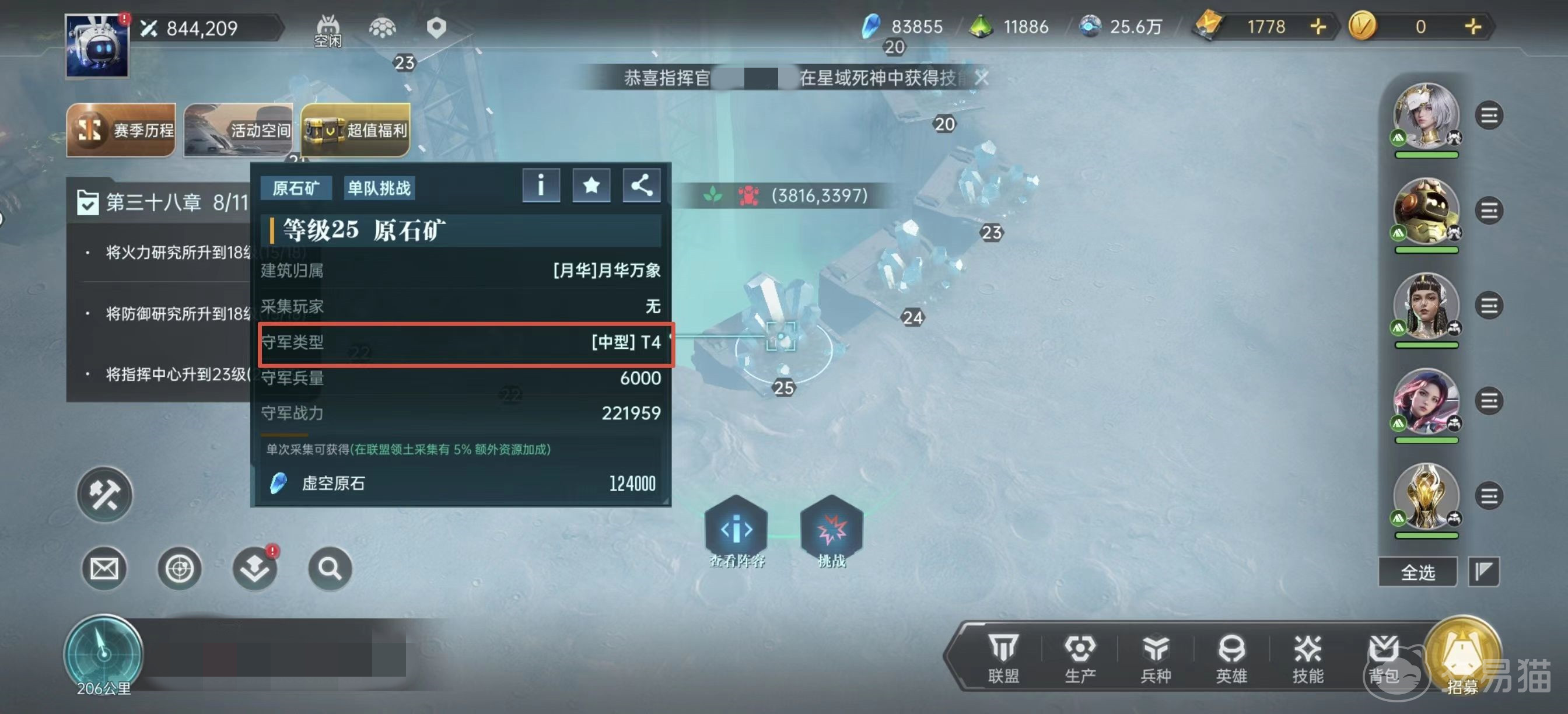 打下来资源地之后,接下来就是采集,采集的时候要注意尽量在联盟领土范围之内去采集,这样有5%额外加成。另外建议大家不要跟着主线采集任务走,因为主线采集任务并不是最优解,应该选择极限采集的方式。就是将每个阶段主力队伍所能挑战的极限矿点都打到最高级,尽量将所有资源都用来培养一队主力。这样可以尽早的去挑战高级矿,高级矿产出的资源数量多很多,性价比非常高。