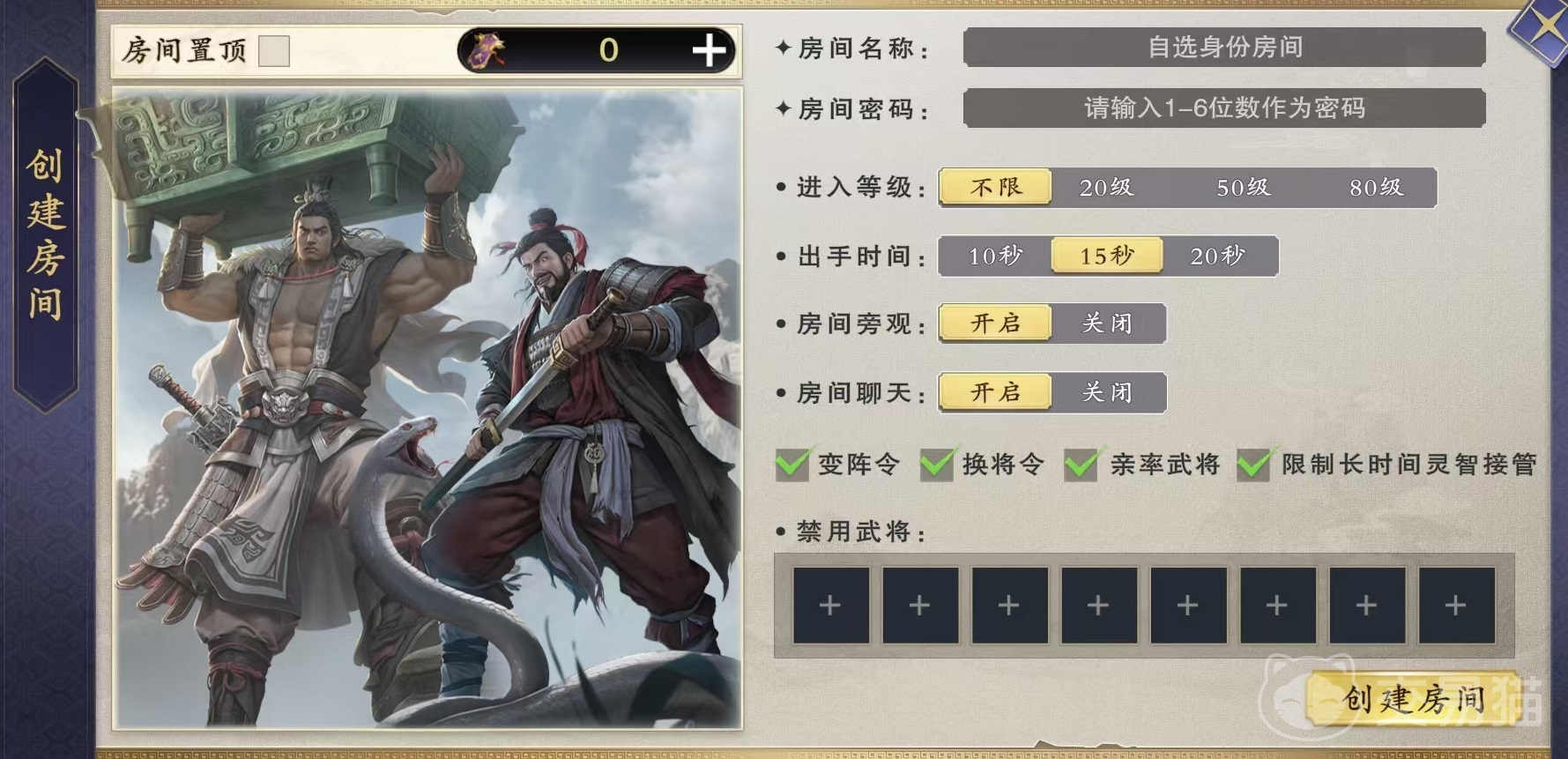 进入游戏主页面之后,可以直接在这里看到有房间选项,然后进去后有两种不同的模式,分别是楚汉争霸和身份模式。大家根据自己的爱好去进行选择,其中楚汉争霸采用的依然是赛季制。进去之后有不同的选项,包括创建房间和快速加入,如果自己想要建房就点击创建房间,这里有多种不同的设置,输入房间名称,房间密码,设置好进入等级,出手时间以及是否允许旁观,是否允许在房间聊天等,这些都是房间必须要设置好的,