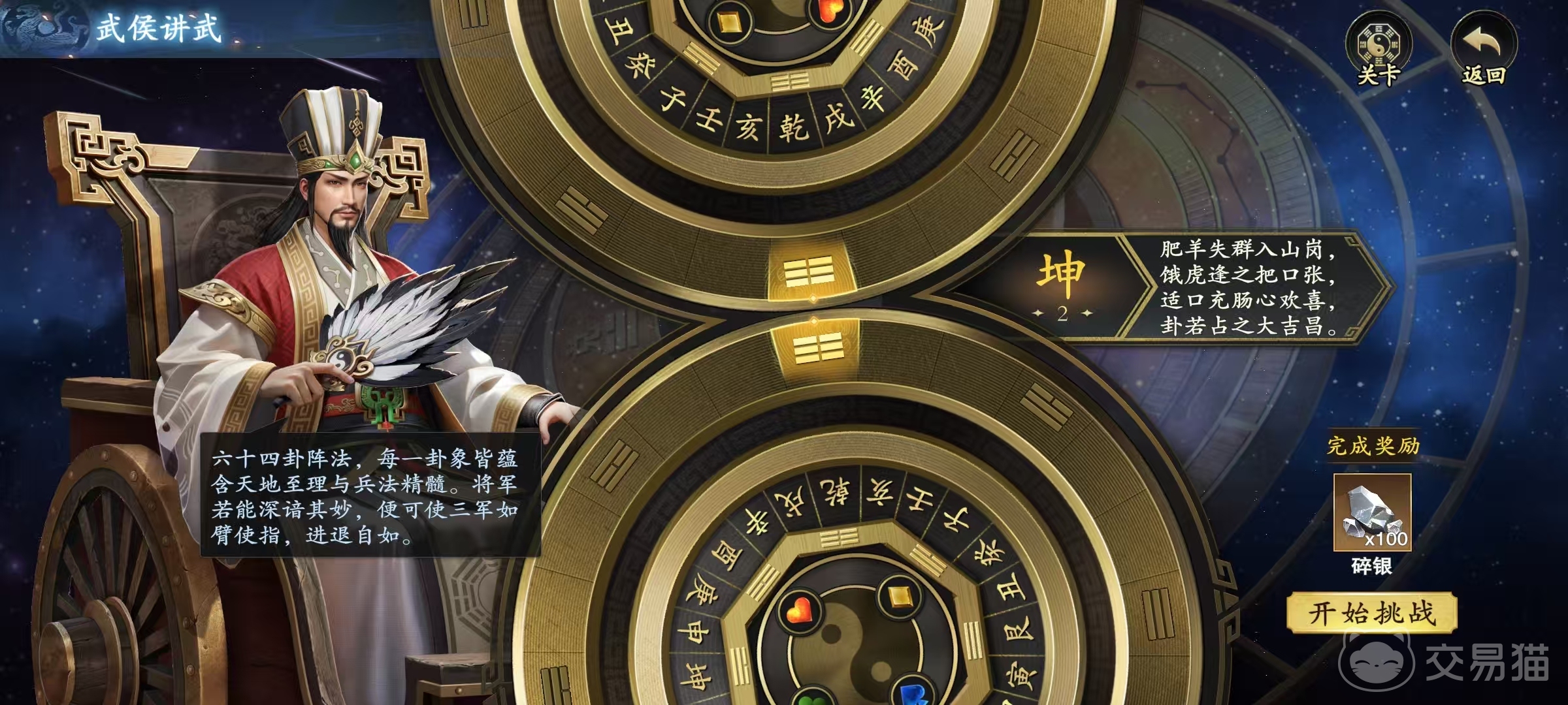 如果一些确实比较难以完成的任务,还支持手动进行更换,每8小时可以手动更换一次,大家也可以更换之后再次去完成。第3个途径是大家来到游戏中的战役玩法,也就是pve玩法,这里面有武侯讲武活动,进去之后这其实是一个闯关活动。大家完成不同的关卡,可以得到各种奖励,其中就有碎银子。选中要挑战的关卡之后,直接点击开始挑战就可以进行战斗了,前面关卡相对比较简单一些,所以大家只需要根据提示去做,就可以轻松拿到奖励。