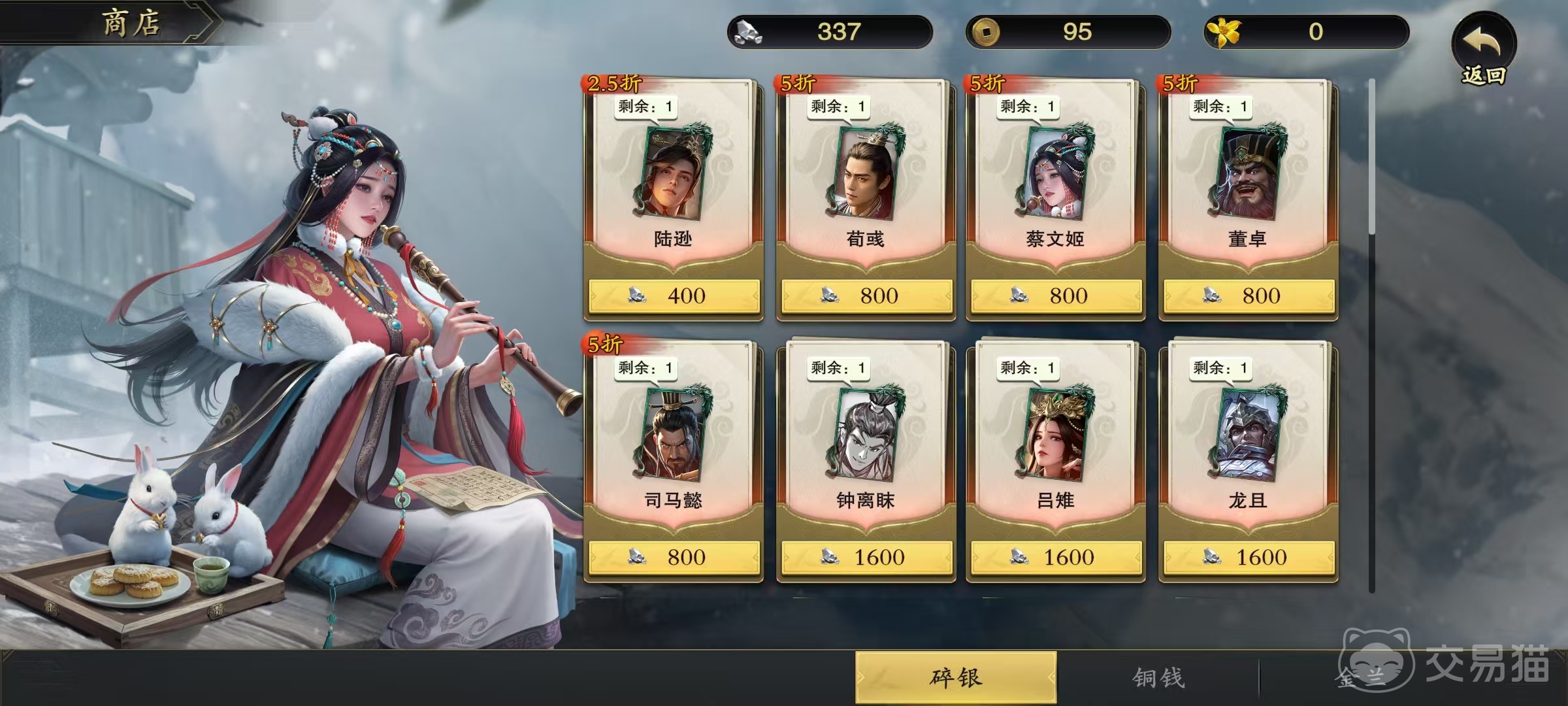 最后游戏还会发布一些限时开放的活动,加入进去之后也可以获得各种奖励,只是并不属于常驻,所以要视情况而定。大家获取到的碎银直接打开商店之后就可以看到有碎银商店。这里通过花费一定数量的碎银就可以购买到武将,根据不同的折扣,也有个不同的价格。例如2.5折就只需要400买一个。5折就需要800才能够买一个,这里可以购买到的道具有很多,所以碎银有很多用途。
