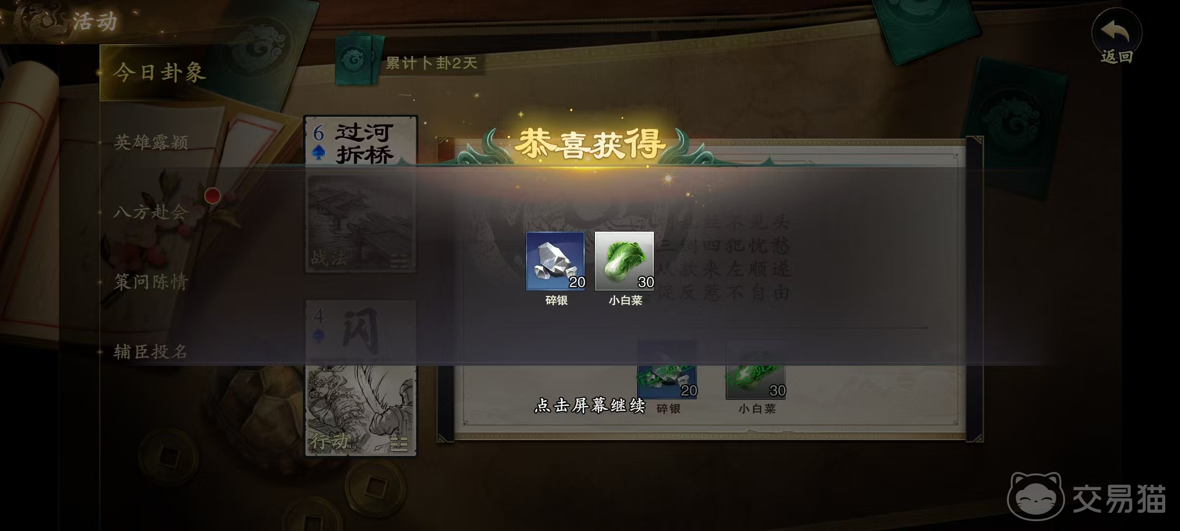 第1个活动是每日卦象,大家通过活动入口可以直接进来,然后每天通过抽取卡牌的方式来进行卜卦,可以获得少量碎银和小白菜等奖励。然后是来到每天任务中,这里每天都会更新任务,只需要满足要求就可以赠送碎银等奖励。活动也非常简单,例如造成指定数量的伤害,打出指定张数的牌,或者是达到一定局数的胜利等,这些大家只需要完成几局战斗后就可以得到。