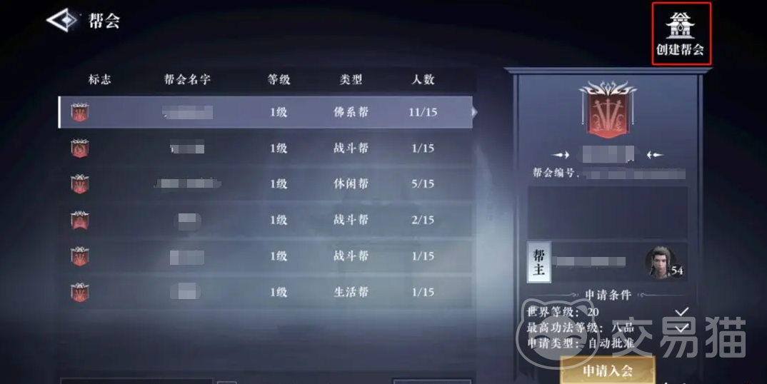 还能领到帮众完成日常任务,参加资源副本。如果不想自立门户,也可以选择加入其他帮会,点击其他玩家创建的帮会,能看到申请入会的选项,只有满足对应申请条件才能申请加入。