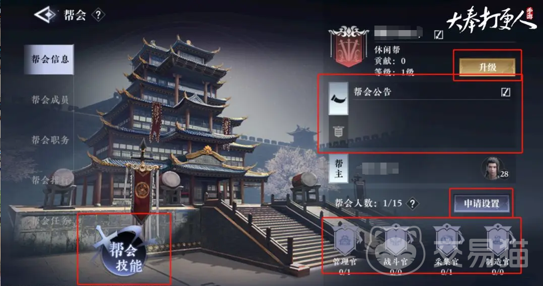 在菜单界面点击右下角的”帮会”,就能进入到对应界面,右上角点击一下就能创建帮会,只需要消耗1枚大奉铜板,就能成功创建属于自己的帮会,作为帮助,能修改帮会名称,公告,宣言,还能处理其他玩家的加入申请,以及职务的变动,还有最关键的帮会技能以及帮会升级。