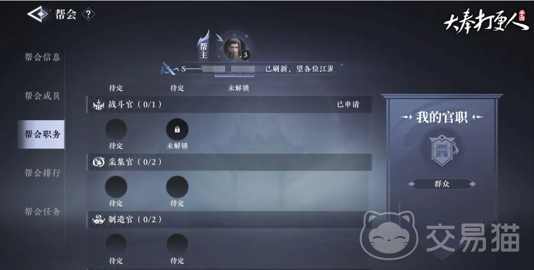 作为帮会的帮众,可以每天去接取帮会的任务,也能主动申请成为其中的要职人员,不仅仅是一份荣耀,成为不同的职务,还有不同的加成,”战斗官”能带来战斗属性的加成效果;“采集官”有一定的几率增加采集物的数量;“制造官”可提升打造“极品”装备的概率。