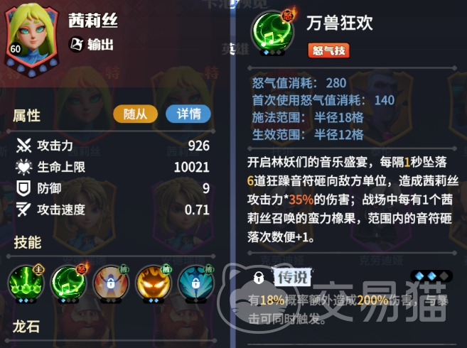 有着万兽之灵称呼的茜莉丝,可以常驻卡池中的后排输出英雄,她的怒气技能能每隔1秒坠落6道音符砸向敌人,造成与茜莉丝攻击力挂钩的伤害,而且战场中每有一个茜莉丝的橡果,范围内音符的砸落次数加1。套装推荐使用“共生契约”,站在后排,技能有召唤,因此可以充分发挥这个套装的效果,有召唤物造成伤害的时候,可以给使用者恢复伤害量一定的生命值。而当使用者造成伤害的时候则给召唤物治疗,这样整个队伍就能拥有不错的续航了。