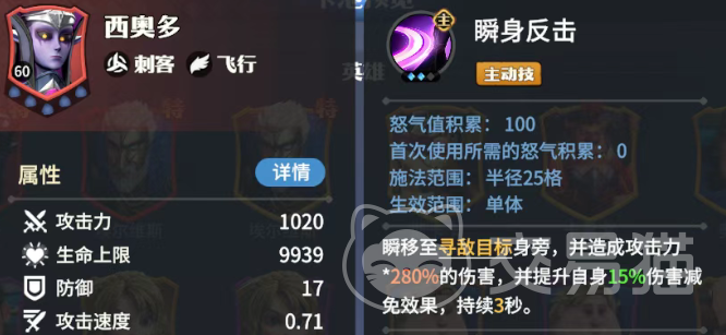 飞行刺客英雄,属性数值不错,主动技可以瞬移到寻敌目标的身旁造成伤害,同时自身获得伤害减免,升级到史诗还可以将一段时内受到的伤害转化为治疗量,进一步提高了生存。怒气技则是进入放逐状态,不会受到任何战斗的影响,同时对敌人发动10次突袭,每次都会造成一定伤害,首次突袭距离25格,后续距离10格,并在结束的时候停留在最后一次突袭目标所在地,升星可以提高突袭次数上限至13/15。