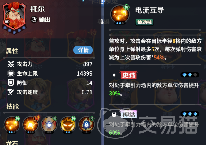 优质输出手,被动普攻可以在敌方目标之间弹射,每次弹射伤害会衰减。怒气技能则是牵引立场,可以向敌方所在位置上空发射磁力球将范围内的敌人向着球中心牵引,并在7秒的持续时间内每隔一段时间造成一次攻击力挂钩的伤害,升级降低触发间隔与伤害倍率。托尔输出很高,不过也比较脆,可以称得上是玻璃大炮。