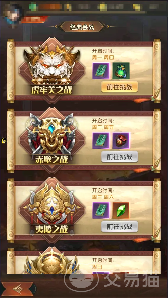 资源分配需聚焦核心产出。集市每日限购经验书必买,功勋商店兑换粮草保障发展,跨服商店优先兑换突破石。圣兽秘境产出的首饰装备可通过击败镇守者提升掉落率,建议每日打满5次化身次数。经典会战按周开放历史战役,虎牢关产材料、赤壁出米酒、夷陵掉精炼石、官渡送拜帖,建议根据需求选择参战。