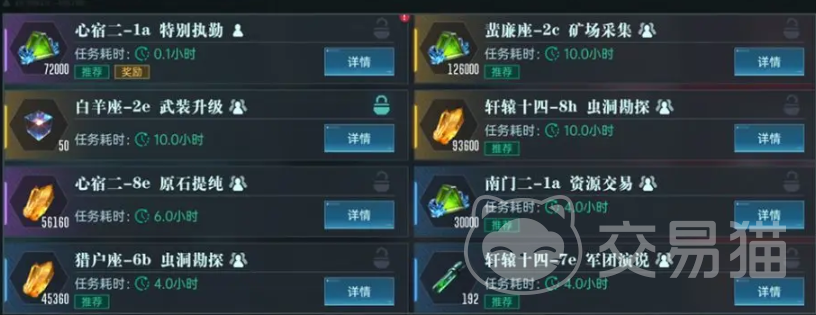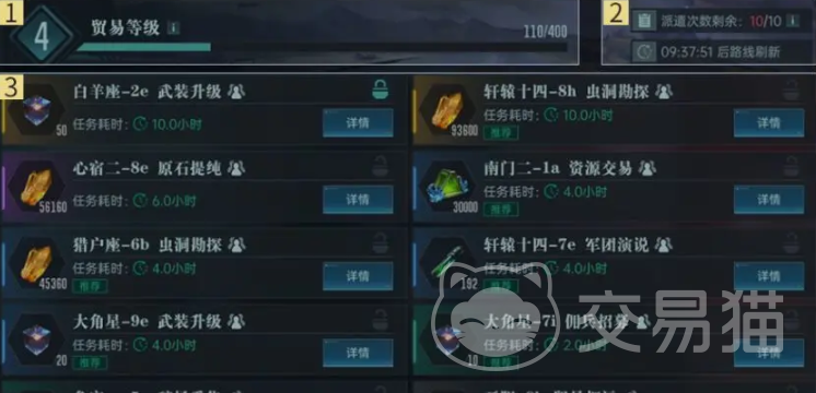 在基地建造了“贸易中心”后就可以解锁这个功能,从日常挑战找到星际贸易页面,左上角是当前贸易等级和经验,右上是派遣的次数和任务刷新还需要的时间,而整个界面的下方则是各种任务、奖励、以及耗时。