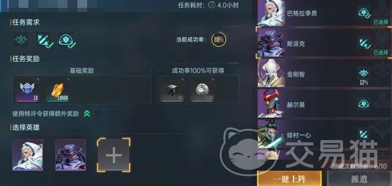 贸易任务有稀有度区别,稀有度越高基础奖励约好,当然耗时越长,所需的英雄数量也会增加。能否完成任务会有一个成功率的设定,这个需要上阵英雄满足贸易所需的特质,这样才能提升成功率。不足100%有几率失败,达到100%则还有额外奖励。