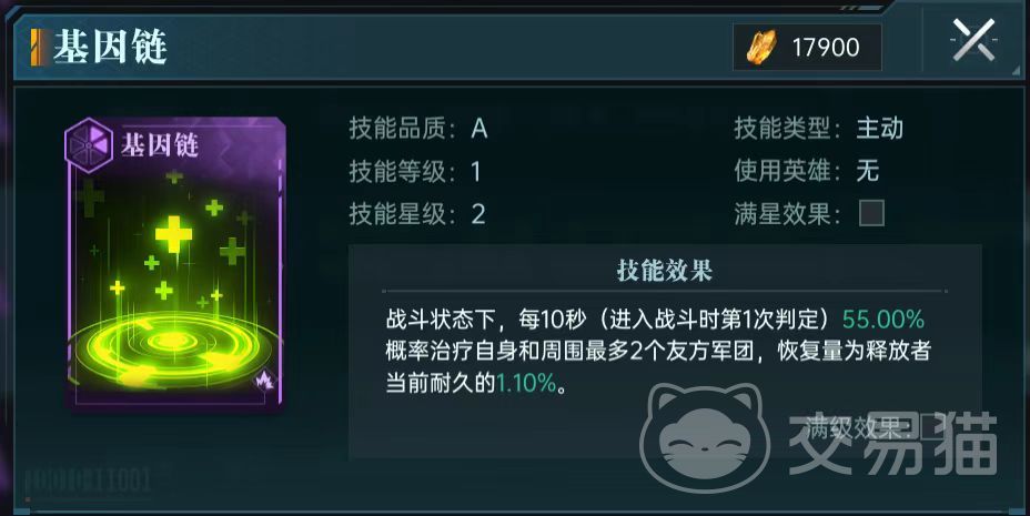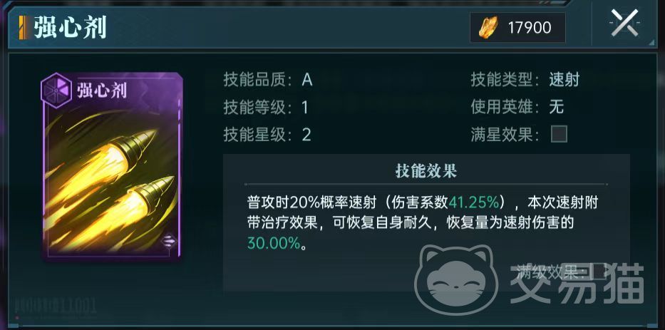 第2个是基因链,基因链也是主动类型,在战斗状态下每10秒进行一次判定,有几率恢复自身和周围两个友军的耐久值,满级时恢复量为施法者当前耐久的4.4%。这是a级技能中唯一一个可以提供范围治疗的技能,所以强度很高,配合上治疗队伍,可最大程度提升治疗量。第3个强心剂,a级速射技能,在普攻时有几率触发速射,本次速射还会附带治疗效果,可以恢复自身耐久,恢复量为速射伤害的30%。也就是打出的伤害越高,恢复耐久也就越高。是速射技能中唯一一个可以提供治疗的技能,搭配速射队使用非常完美。