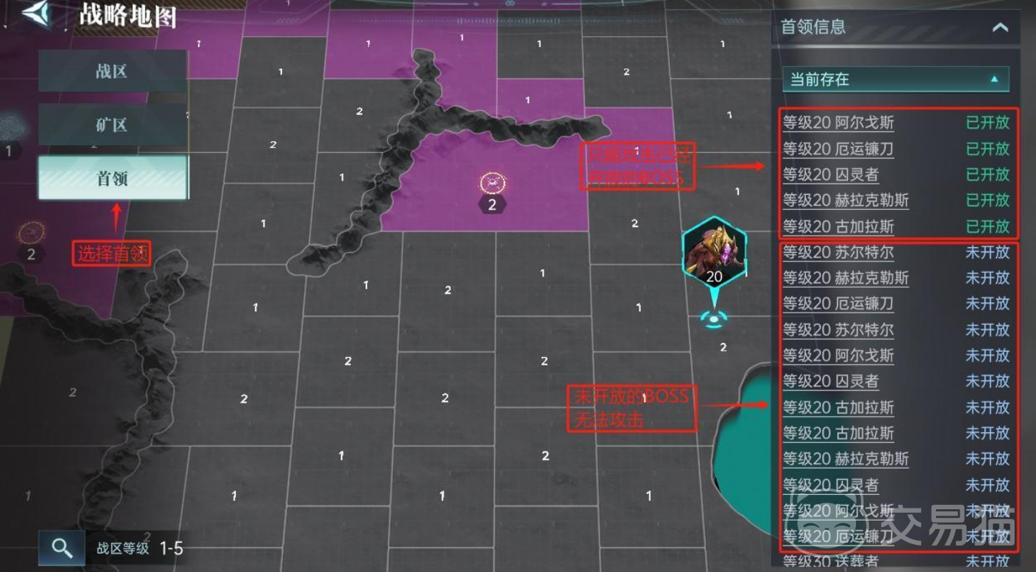 那BOSS开放后玩家该如何查找呢?方法十分简单。进入地图界面后,将视角缩小,界面上方会出现多个选项,包括“战区”、“矿区”和“首领”。选择“首领”选项后,地图右侧将会显示所有BOSS的状态,其中包括已经开放的BOSS和尚未开放的BOSS。只有处于“已开放”状态的BOSS才能被玩家攻击,而“未开放”的BOSS则暂时无法挑战。通常未开放的BOSS是因为玩家还每进入该BOSS所在的区域,或者该BOSS的解锁条件尚未满足。