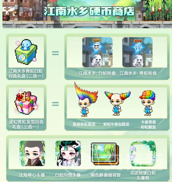 其中商店的最大奖便是江南水乡青蛇白蛇的自选礼盒。咱们可以从这个礼盒里面选择白蛇转盘或者青蛇转盘。除了这个礼盒外还有着迷幻霓虹发型自选礼盒三选一。三个发型都是各有特点,玩家们可以选择自己喜欢的来进行兑换。