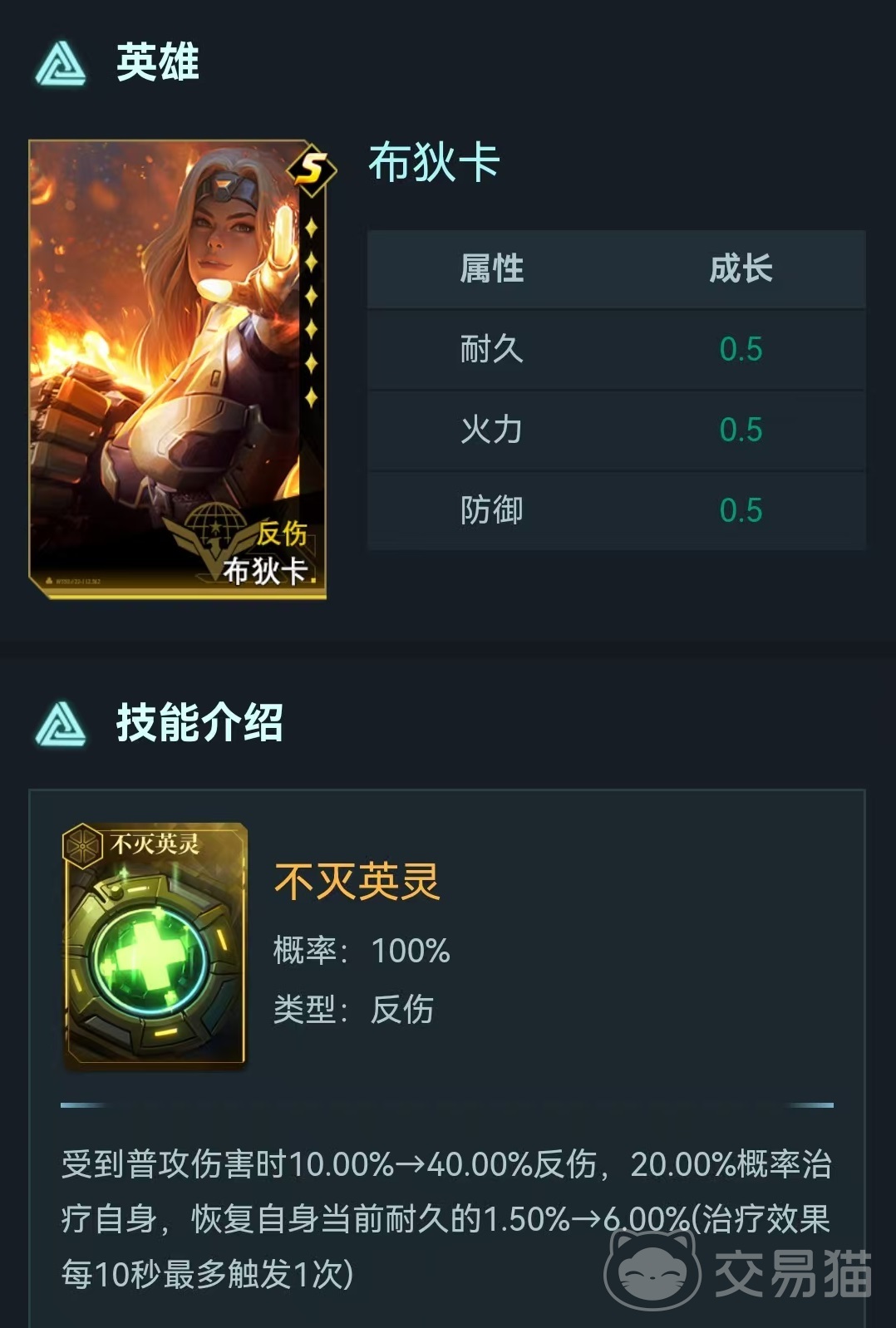 这一套无敌反伤队,又叫回血反伤队,选择的主将是布狄卡,副将是比利。这两个英雄相信大家都非常熟悉,布狄卡更是号称版本之子非常强势。选择布狄卡就是因为他自身的核心技能不灭英灵,在受到普攻伤害持久最多40%的反伤属性,还有20%几率可治疗自身,最高能恢复自身当前耐久的6%,治疗效果是每10秒最多触发一次。该英雄升星之后伤害抗性和反伤都能获得提升。