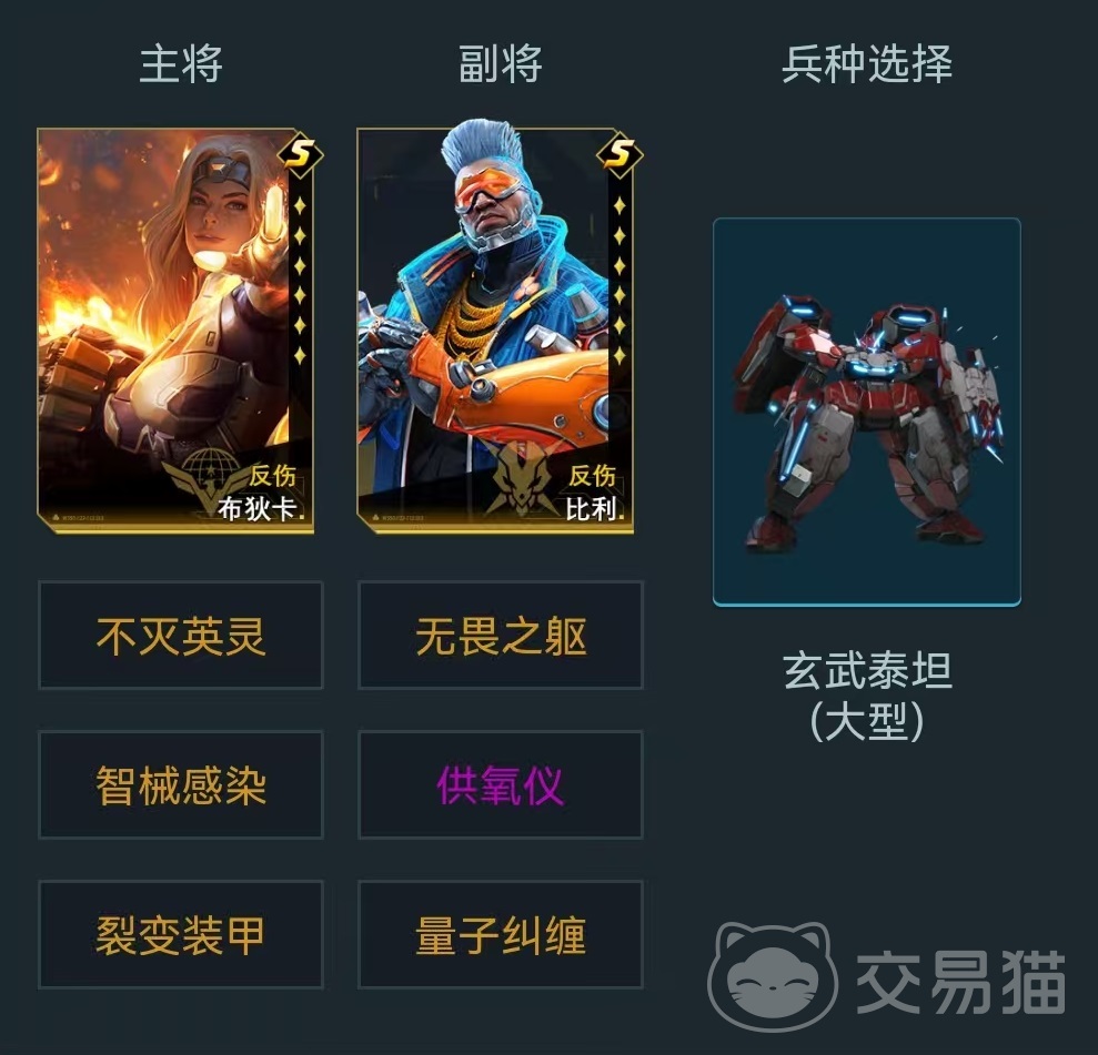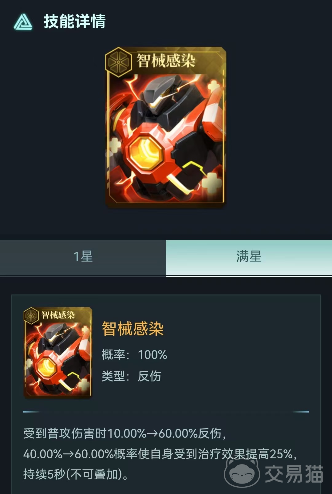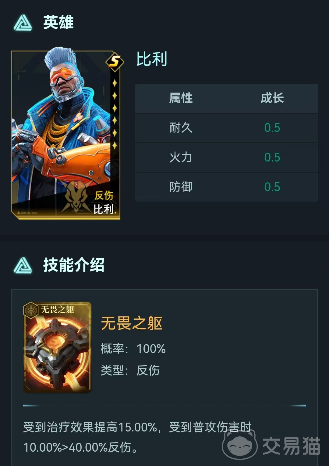 比利也是反伤中的佼佼者,他的核心技能无畏之躯,使得受到的治疗效果提升15%,受到普攻伤害时,有最多40%反伤属性。通过升星可以提升受到的治疗效果以及受到普攻时的反伤属性。技能搭配方面,布迪卡作为主将选择两个橙色技能,分别是智械感染和裂变装甲。智械感染的效果是受到普攻伤害时最多有60%反伤,60%几率使自身受伤的治疗效果提升25%。裂变装甲在受到普攻时有最多90%反伤,25%几率使自身过载,持续两秒。