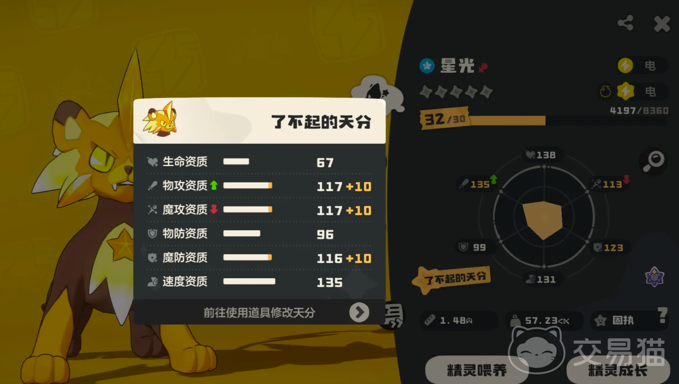 星光狮是小星光的进化形,它的种族值初始总和有641,其中生命为88、物攻和魔攻都是115、物防和魔防是94、速度更是高达135,超过了大部分的精灵,它的特性“电流刺激”能在每携带一个光系技时候,就让入场效果延长一个回合。