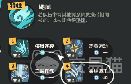 接着就是技能方面,以打速攻体系为主,其特性飓风非常契合翼系队伍,当队伍中的翼系队友携带同样的技能,就会附带迅捷的效果,而这个技能的优势就是先手攻击,这意味着翼王每次出手都比别人块,如果对面是脆皮精灵的话,那么一套就可以带走,从而快速减员对面。