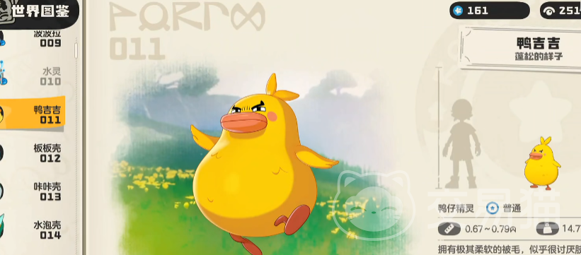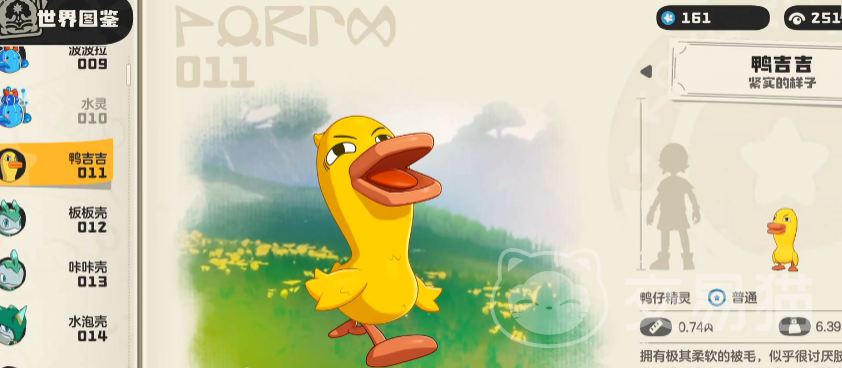 鸭吉吉是游戏中一只不会进化的宠物,也就是说它只有一种形态,身体上的毛极其的柔软,整体形态憨态可掬,喜欢会闪光的物体,对新奇事物也比较感兴趣,很聪明的宠物。
