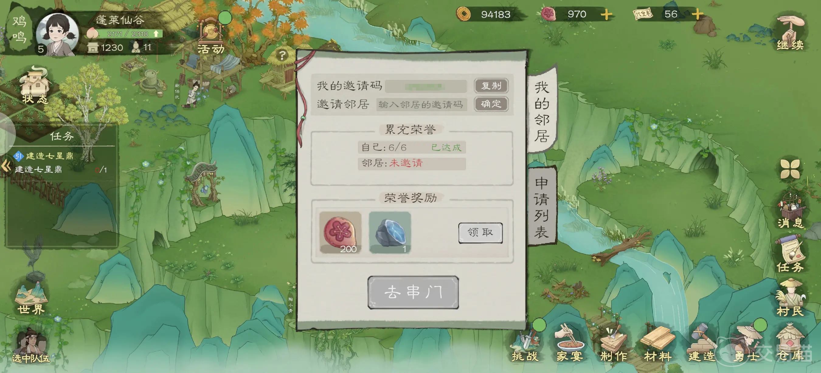 荣誉奖励:在邀请了正式的邻居之后,在自己和对方的累充达到了一定额度之后,就能领取奖励了;邀请邻居也是有一定的条件限制的,需要两名玩家是同时在线的,一方输入了另一方的邀请码就能申请,等另一方通过后,两人就能绑定邻居关系了。