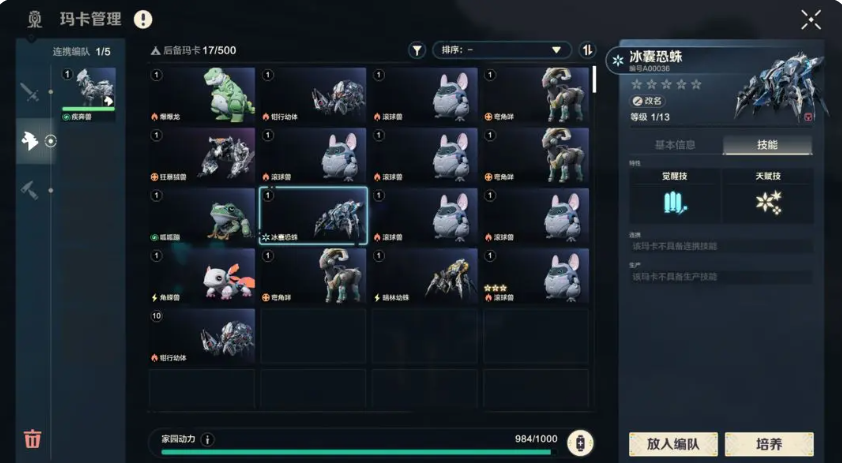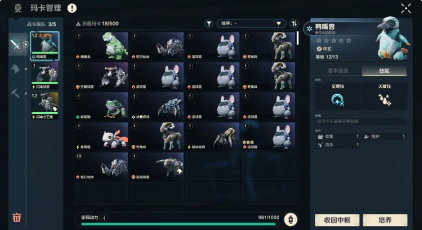 进入家园中枢,点击家园管理,直接选择想要培养的玛卡,右边的详情栏直接点击培养就能进行。宠物的培养可通过:升级,升星,洗练,芯片。升级要使用玛卡训练记录和亚金,在大世界探索时,以及对应的体力副本中,可以比较轻松的获得升级提升玛卡的攻血防三个基础属性,点击快捷放入,就可以将玛卡升到当前最高的等级,也就是角色等级,也就是说玛卡的等级不能超过角色等级。