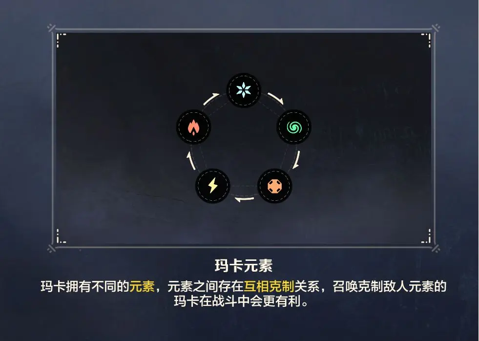不同的玛卡是有不同的元素属性的,目前的属性一共有5种。分别为火属性元素,冰属性,风属性元素,岩属性元素,以及电属性元素,元素之间存在相互克制的关系,火元素克制冰,冰克制风,风克制岩元素,岩克制电,不同的属性也会导致玛卡获得不同的生产技能。