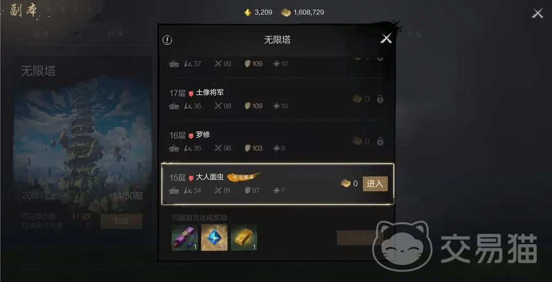 无限塔,这可以理解为一种爬塔的玩法,目前是设置了50层。每层首通就能拿到很多得到奖励,这里包括了比如大量的抽卡道具,武功养成材料等,加入成功通关了最高层,更是能直接获得传说级,也就是粉色品质的剑灵召唤出,可以直接召唤出极其稀有的传说剑灵。全部的层数都通关,或者暂时没有更高层数的能挑战过去,就能利用扫荡得到功能,获取额外的材料,已经通关的楼层都是鞥能进行扫荡的,楼层越高,能获得的奖励就越丰富,每天4点会补充1次扫荡的次数,最高累积3次,扫荡的次数记得不要浪费。