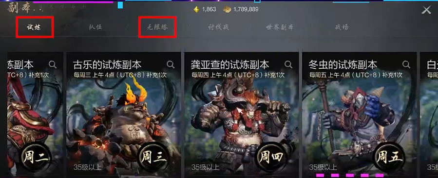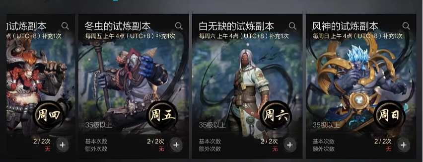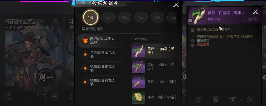 其次看试炼副本,可以直接理解为材料本,大家可以在该副本中获取强化武器,或者防具的寒玉,用于武功强化的秘诀和灵药,还有就是可以兑换金币的金块,不同的试炼副本每周的刷新时间不一样,可以在每周提升战力后再一次性打本。