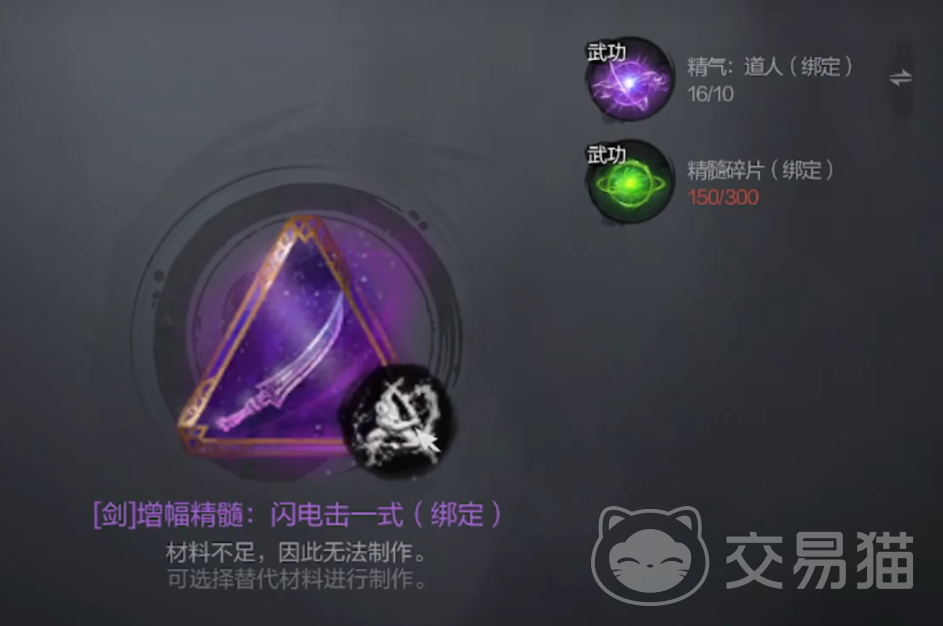 我们需要使用不同的材料,然后不同类型的武功进化时所需要的材料种类以及数量也不同。特别是等级越高的武功变化所需要的材料种类以及数量也就越多,比如紫色类型的闪电一式。想要进化的话,需要耗费10个精气道人以及300个精髓碎片。