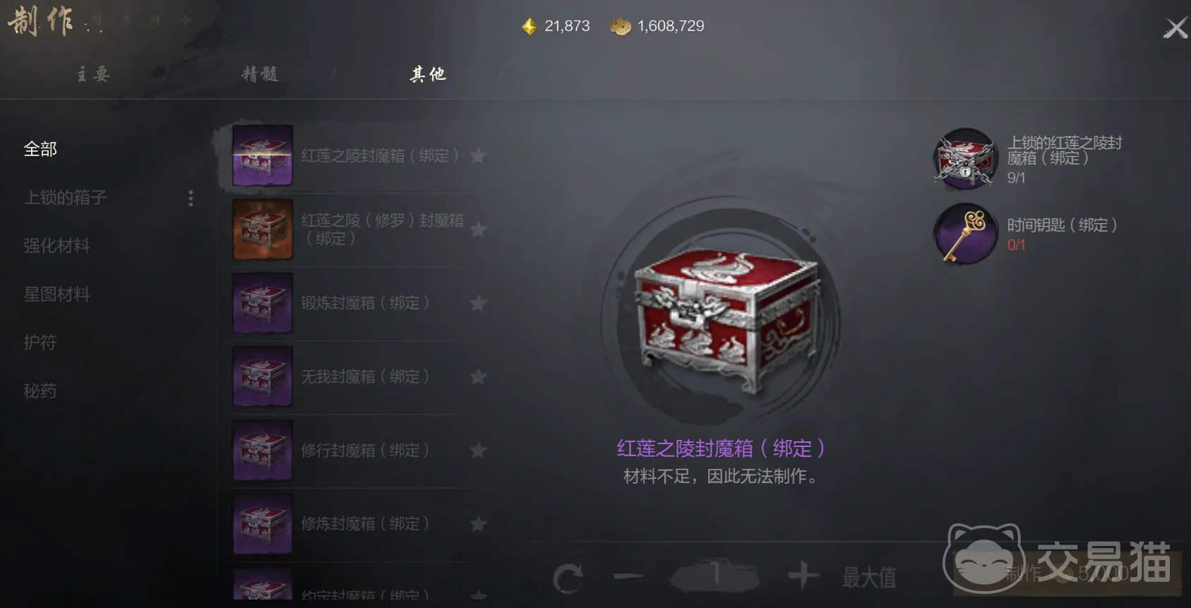对于其他板块的话,可以将游戏中其他可制作的道具都整合在一起,也就是一些杂物。比如强化材料或者可以上锁的箱子,当我们找到足够多的材料时。需要点击三个板块中的一个,然后再点击相应的道具就可以打开制作页面,只需要消耗一定的金币就可以快速制作了。