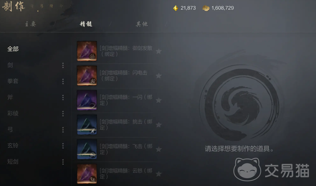 另外还有一个精髓板块,你的话会将武功所需要的精髓道具全部展示在一个栏目当中。我们只需要点击界面左侧的各个分类,即可找到不同武器武功所需要的精髓类型。不同武器上也有着相应的子分类,打开子分类之后,你就可以更快的找到需要制作的道具。