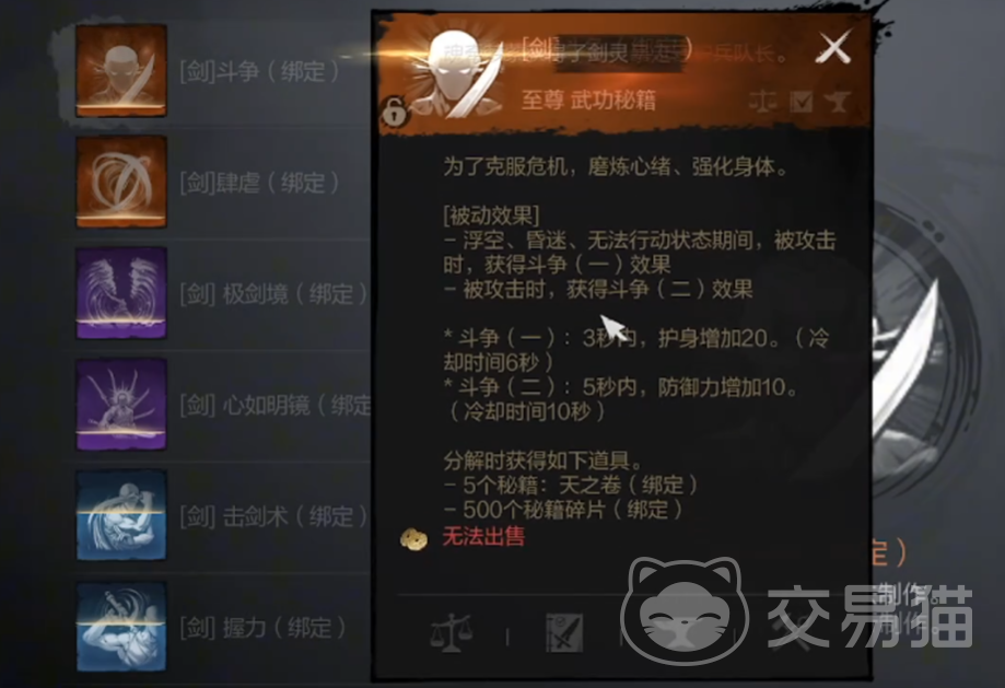当你处于斗争效果时,就可以随机获得两种能力。第一种就是在3秒内,可以提升自己20点的护身值,冷却时间6秒。另外一种就是在5秒内提升10点的防御力,不过冷却时间高达10秒。你将其分解之后就可以获得5个天之卷,以及500个秘籍碎片。